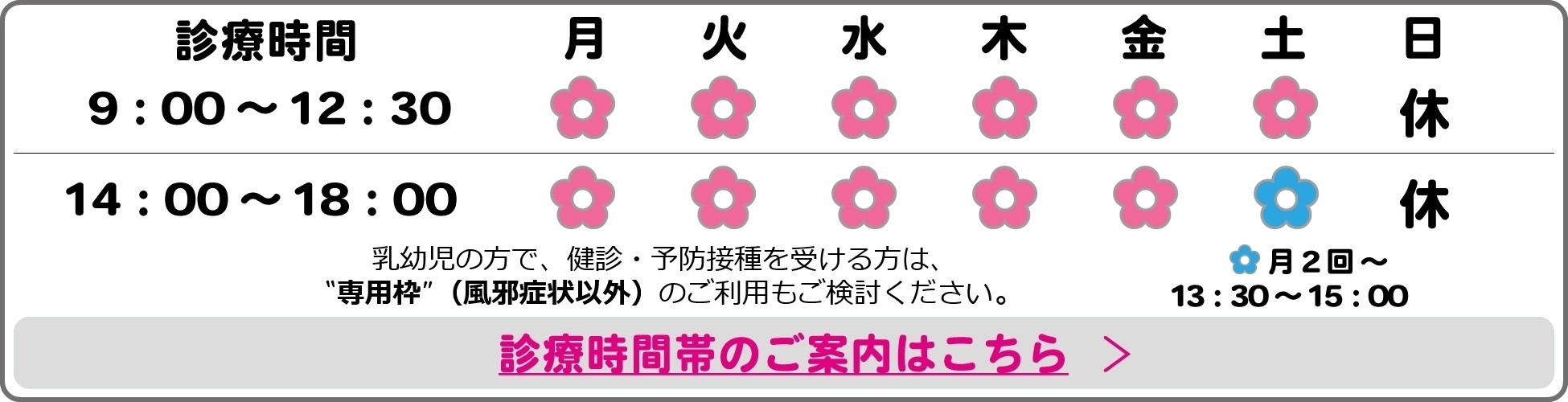 のど・はな風邪、気管支炎・肺炎、胃腸炎、尿路感染、中耳炎、インフルエンザ、溶連菌、発達・発育相談、熱性痙攣、突発性発疹症、手足口病、アデノウィルス感染症、RSウィルス感染症、水痘、おたふく